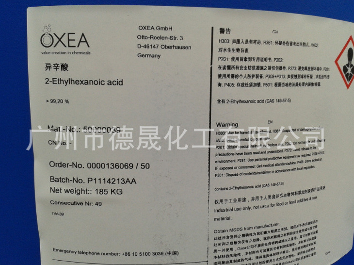 異辛酸為無色微有臭味的液體。 易燃,微溶于冷水,溶于熱水和乙醚,微溶于乙醇??捎米饔推岷屯苛现虚g體,醇酸樹脂改性劑,生產過氧化物以作為聚合反應(例如PE),以及用于潤滑油酯和PVC穩定劑等。