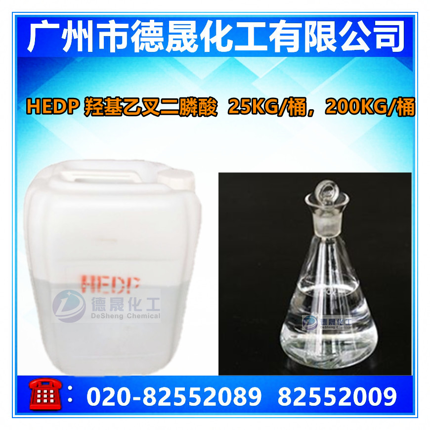 HEDP是一種有機膦酸類阻垢緩蝕劑,能與鐵、銅、鋅等多種金屬離子形成穩定的絡合物,能溶解金屬表面的氧化物。在250℃下仍能起到良好的緩蝕阻垢作用,在高pH下仍很穩定,不易水解,一般光熱條件下不易分解。耐酸堿性、耐氯氧化性能較其它有機膦酸(鹽)好。可與水中金屬離子,尤其是鈣離子形成六圓環螯合物,因而具較好的阻垢效果并具明顯的溶限效應,當和其它水處理劑復合使用時,表現出理想的協同效應。
