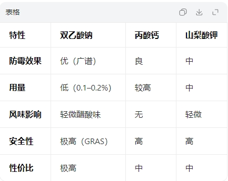 性價比高防霉效果優于丙酸鹽,用量僅為丙酸鈣一半,成本更低。